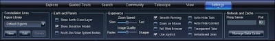 O sistema de abas empregado no WorldWide Telescope permite a organização das configurações e recursos por temas, ajudando na procura pelas ferramentas. Se o usuário quiser alterar qualquer configuração do programa, não encontrará dificuldade alguma, pois todas as principais opções são facilmente acessíveis através da barra de tarefas principal do programa.